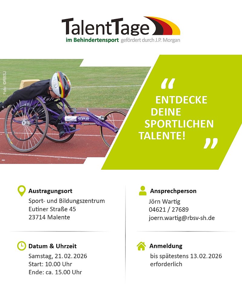 Am 21.02.2026 findet von 10:00 Uhr - 15:00 Uhr in Malente wieder ein TalentTag statt. Wir suchen junge Menschen mit Beeinträchtigung die Lust auf Nachwuchs- und Wettkampfsport in den Sportarten: Para Judo, ID Judo, Para Leichtathletik, Para Schwimmen, Rollstuhlbasketball und Para Tischtennis haben.
